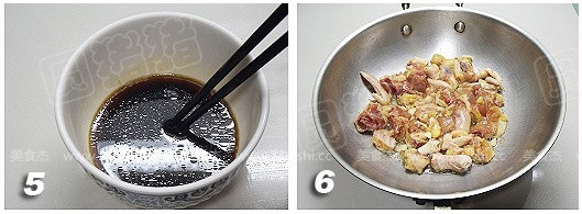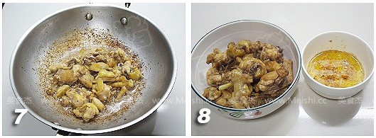 5.炒鍋燒熱了,放入少許油,涼油放入雞塊,用中火煸炒(如果有條件油炸的話,就將油燒熱,放入雞塊大火炸至金黃色撈出,再度把油燒熱, 放入雞塊復炸1分鐘,這樣效果會更好)