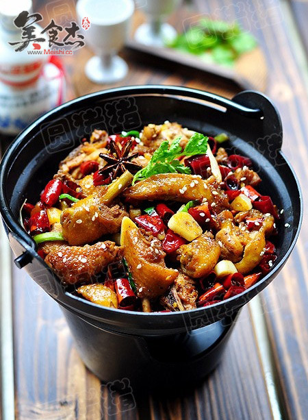 3、煸出油的雞塊和炒香的香料,要加入醬料一起燒一會,這樣才能將兩種味道綜合起來。單用醬料會太干,很容易燒干鍋,雞塊還沒入味,因此要加少許水在醬汁里面,另外用開水的話可以幫助砂糖溶化。