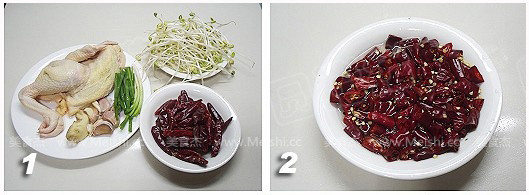 2.將雞切凈斬成小塊,香蔥切長段,大蒜和生姜剁成蓉,黃豆芽剪去根部