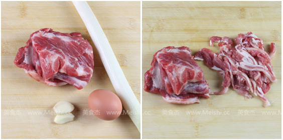 3.切完肉放料酒、鹽抓一下,然后加少許全蛋液抓勻,最后上一點淀粉抓勻就算腌好了