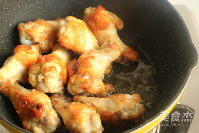 雞翅根放入平底鍋煎至油份逼出,表皮變焦香,這個過程大約5分鐘。