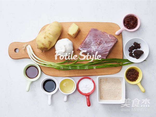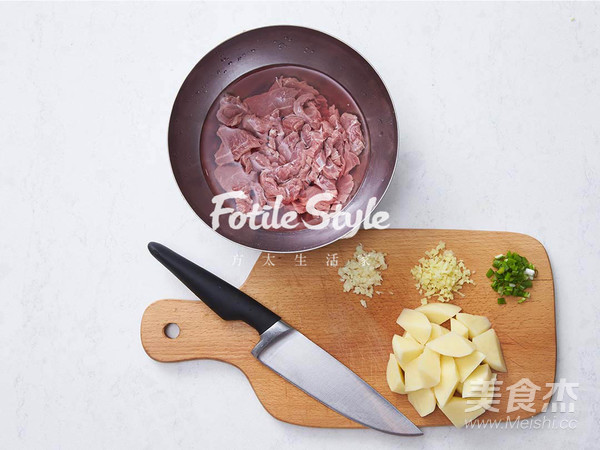 將牛肉洗凈,切成0.5厘米寬度,3厘米長的長條,并泡冷水半小時;土豆洗凈、去皮,切成滾刀塊;蔥、姜、蒜切末備用
