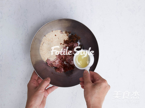 取出牛肉條,瀝干水分,加入蒸肉粉3湯匙、食用油2湯匙、孝感米酒1湯匙、郫縣豆瓣醬1湯匙、老抽1茶匙、生抽1茶匙、紅糖1茶匙,拌勻后,腌制10分鐘