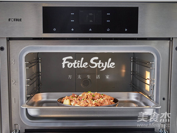 將土豆擺在盤子中間,牛肉條裹上蒸肉粉后放在土豆上,放入有孔蒸盤中,放入方太蒸箱中間層