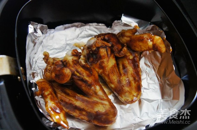 5.空氣炸鍋200度預(yù)熱,取錫紙墊底,放入雞翅,根據(jù)自己喜歡的口味,視雞翅的大小炸10-20分鐘
