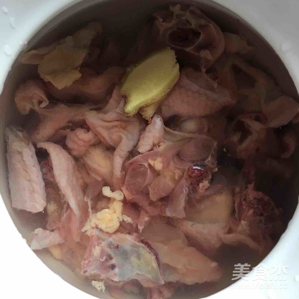 選帶雞油的部分放入砂鍋內,放入姜片,枸杞子紅棗片(各十個左右),加入適量清水。中火燒開轉小火慢慢燉。