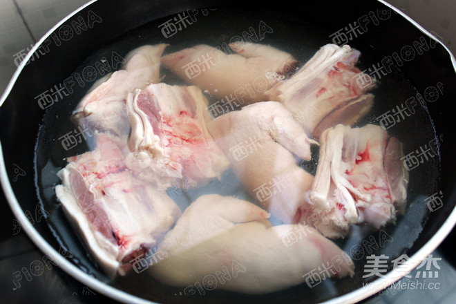 豬蹄選前蹄,剁塊洗凈,冷水下鍋焯燙至發白。撈出洗凈浮沫