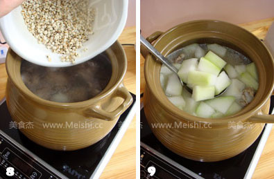 4.把洗好的薏米倒入鍋內,蓋上鍋蓋煲約2-3小時,最后半小時前放入冬瓜,調人適量鹽即可