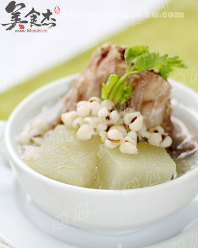 冬瓜含蛋白、糖類、胡蘿卜素、多種維生素、粗纖維和鈣、磷、鐵,且鉀鹽含量高,鈉鹽含量低;功效有清熱解毒、利水消痰、除煩止渴、祛濕解暑。用于心胸煩熱、小便不利、肺癰咳喘、肝硬化腹水、高血壓等;薏米常食可以保持人體皮膚光澤細膩,消除粉刺、斑雀、老年斑、妊娠斑、蝴蝶斑,對脫屑、痤瘡、皸裂、皮膚粗糙等都有良好療效。經常食用薏米食品對慢性腸炎、消化不良等癥也有效果。正常健康人常食薏米食品,既可化濕利尿,又使身體輕捷,還可減少患癌的幾率。