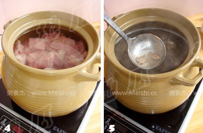 2.排骨和腔骨沖洗后放入砂鍋,一次性加入足量的水,約5升,大火煮開煮出血沫后用勺小心撈出血沫直到湯潔凈無雜物