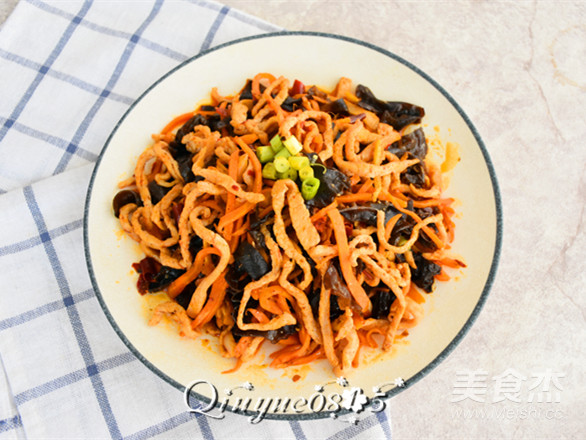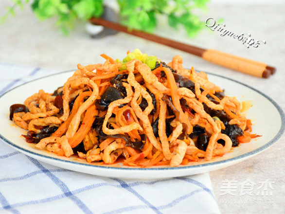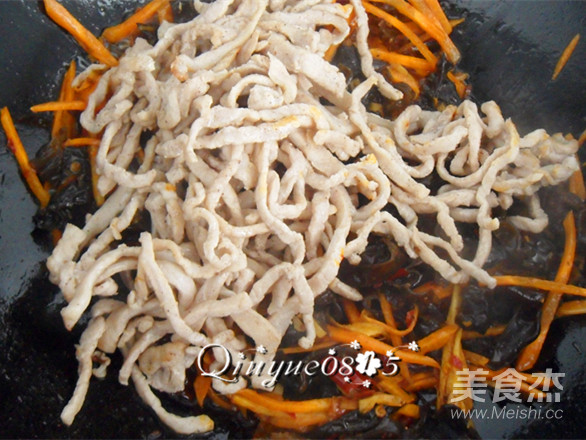放入肉絲翻炒均勻,調(diào)入魚香汁兒,最后用水淀粉勾芡。