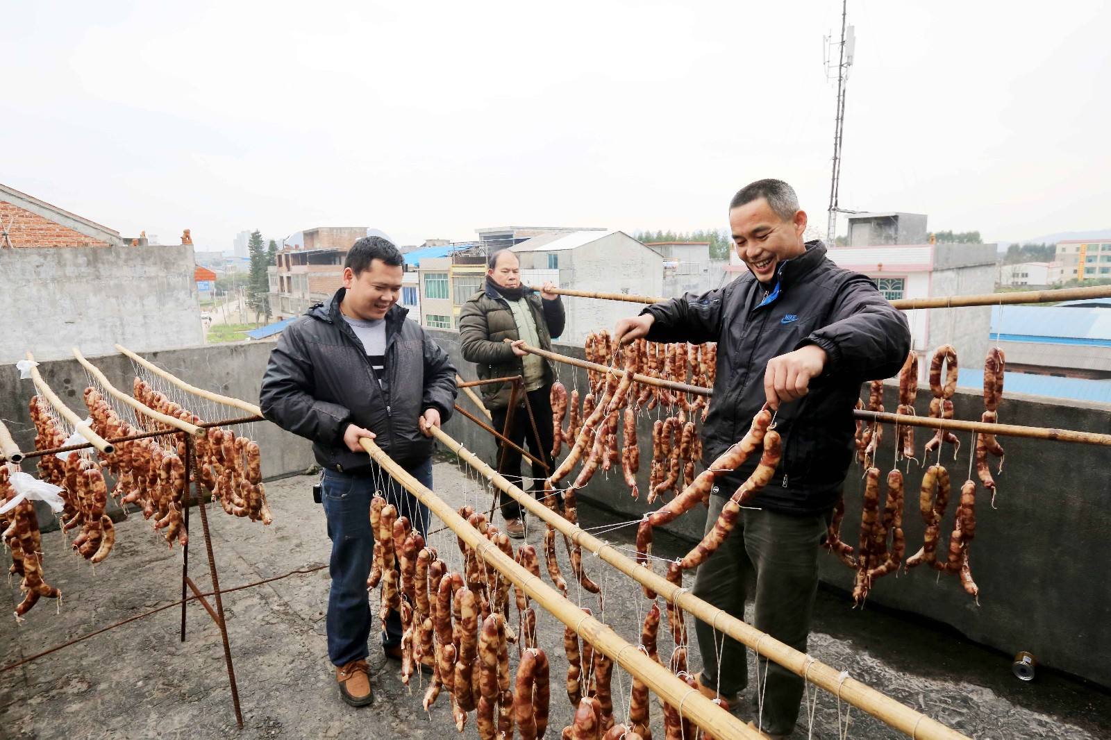 我們將豬后腿肉反復加大量的食鹽在腳盆中搓洗,直到一整袋鹽完全浸入