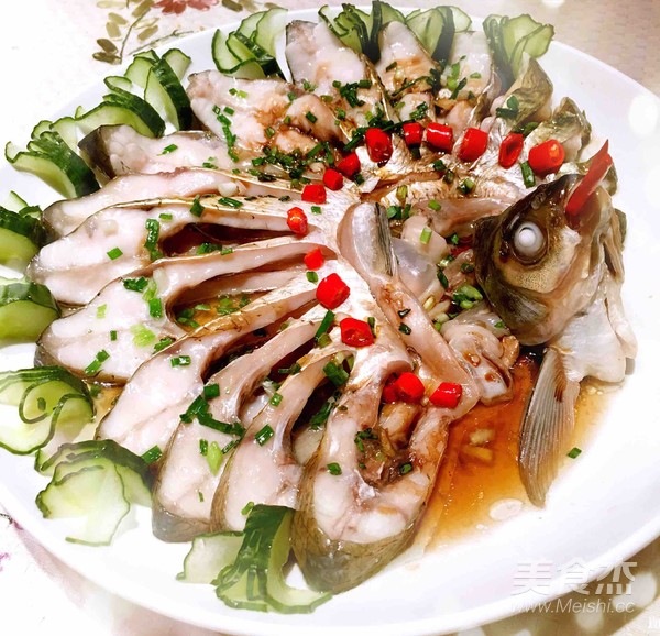 7.將黃瓜 鮮紅椒 擺好 撒上香蔥,少許鮮醬油 。熱油澆在魚身上即可!