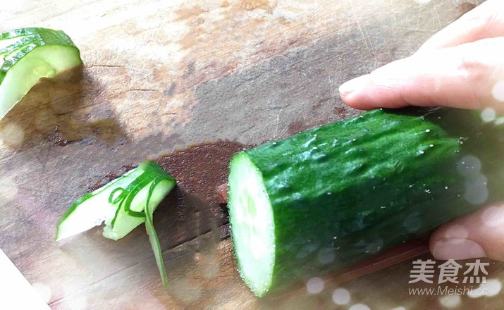4.準備黃瓜做擺盤造型用,可自行創意。圖中用筷子放二側,切至一半距離即可,切五個薄片 然后斷開。