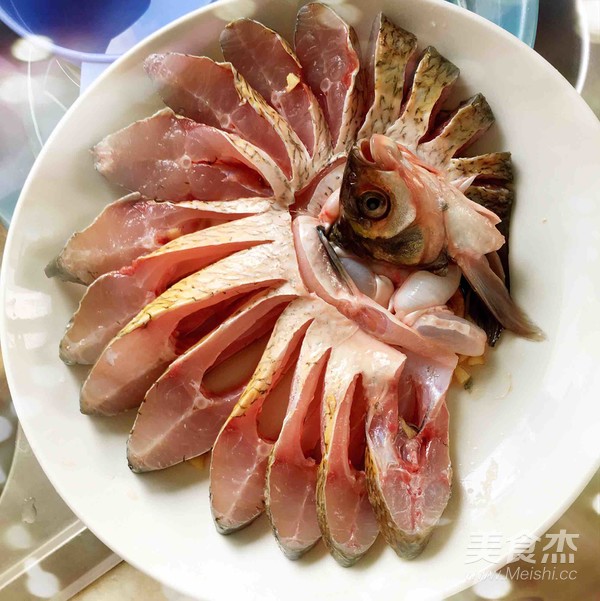 3.切好加料酒 姜絲 鹽腌制十分鐘,按圖中形狀擺好姿勢,尾巴掩在魚頭下即可。