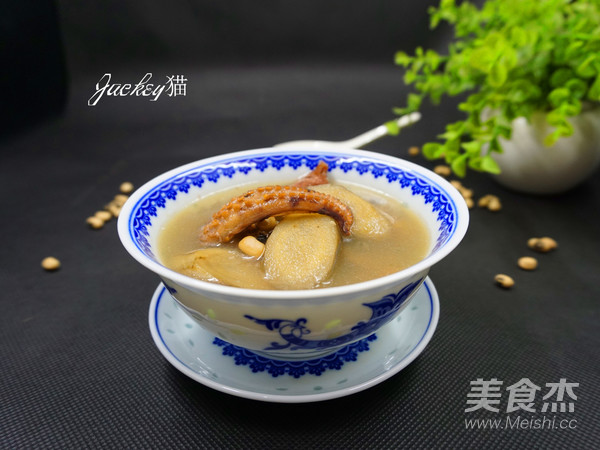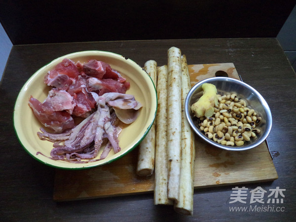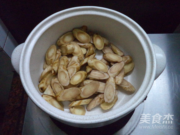 豬骨、眉豆洗凈,干魷魚泡發,姜去皮,鮮牛蒡用刀背輕輕刮去表皮洗凈備用