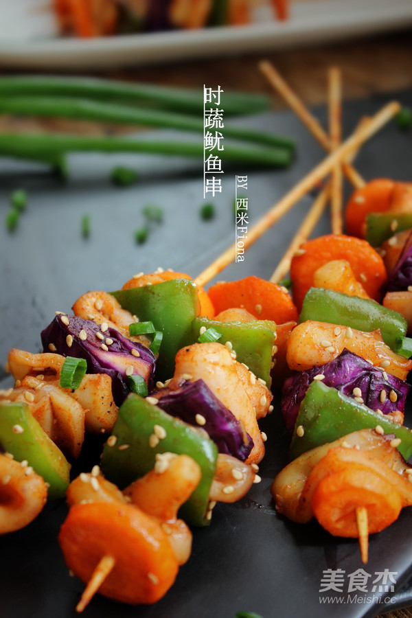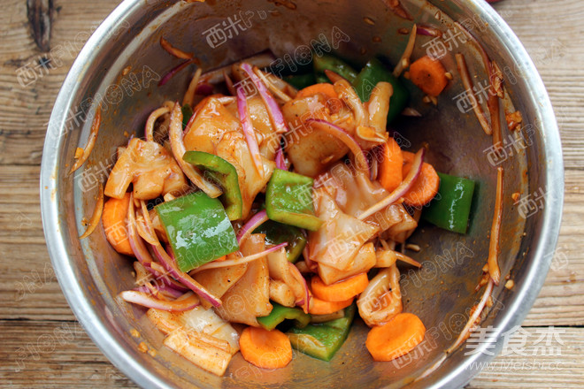 洋蔥切絲,蒜瓣切末,與魷魚塊放一起,調入1湯匙蠔油,1湯匙辣椒醬,黑胡椒碎,適量鹽,適量糖攪均勻,再加入青椒塊,胡蘿卜片。腌制20分鐘左右。