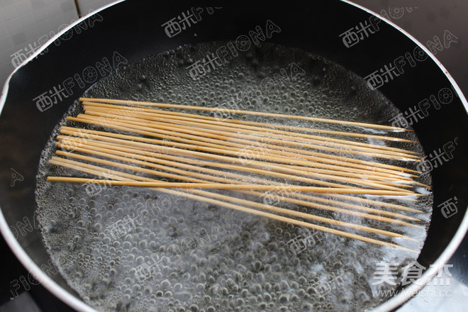 把竹簽子用開水煮2分鐘,一是消毒,二是一會兒烤的時候不至于烤焦。