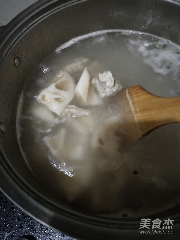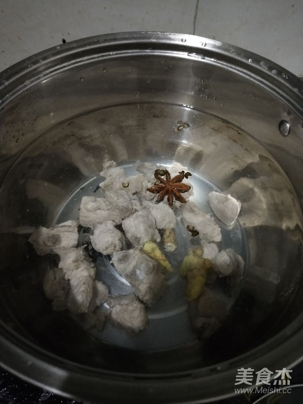 水燒開(kāi),放入排骨焯水去血絲