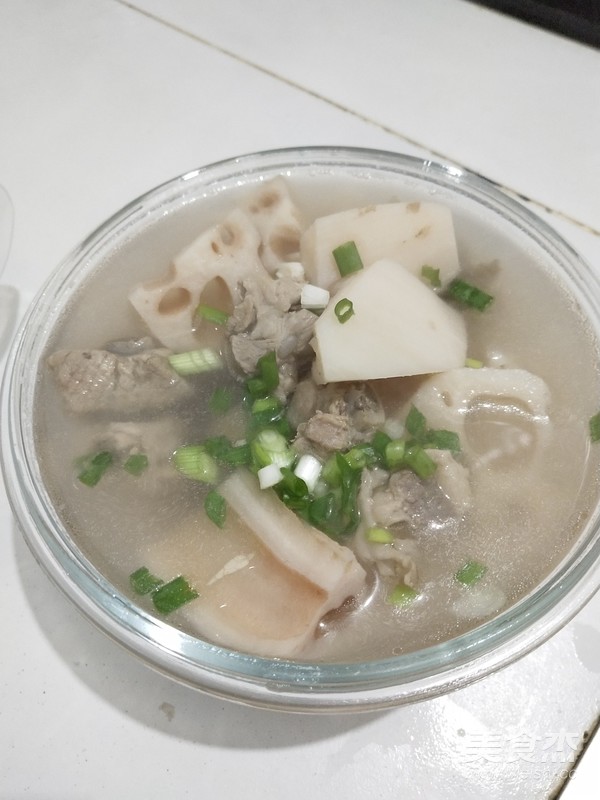 出鍋前幾分鐘放入適量鹽。出鍋后放入提前備好的蔥花即可,健康美味的蓮藕排骨湯就好了