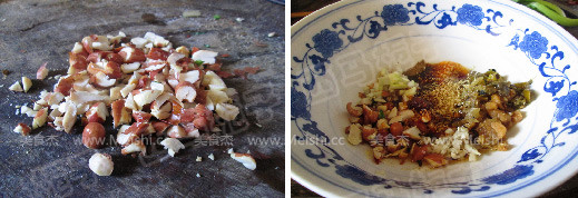 8.取一碗,加入蔥碎、蒜泥、姜粉、花椒粉、冬菜、榨菜、花生碎、醬油、醋、油辣子、麻油