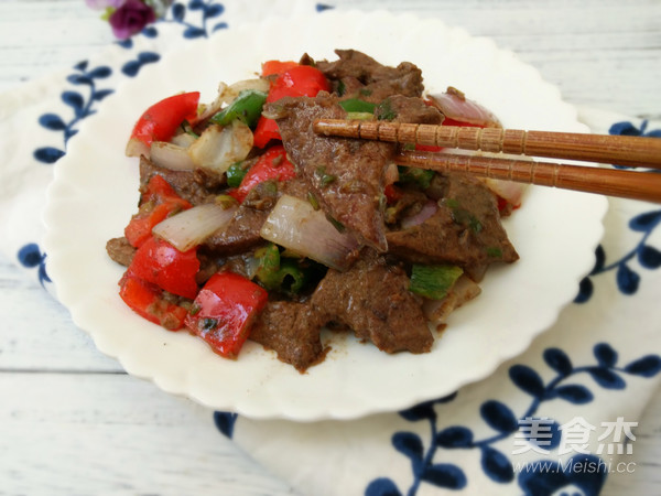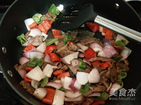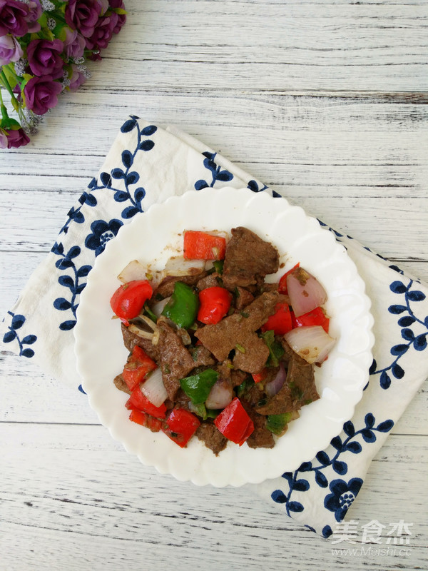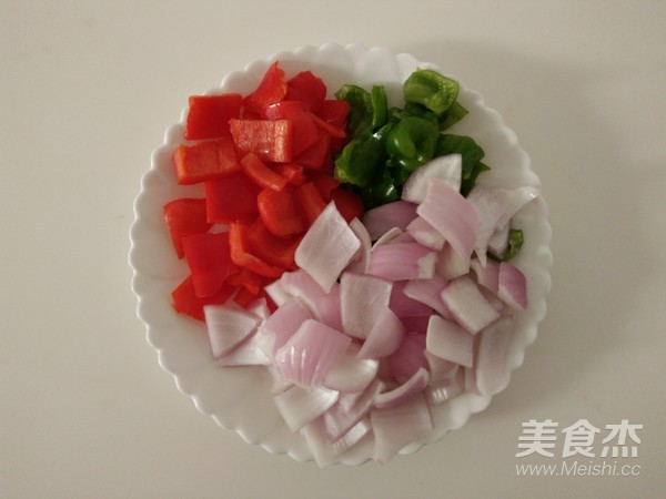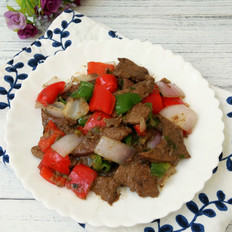 放入洋蔥、青紅椒塊炒熟,加鹽和雞精調味即可。