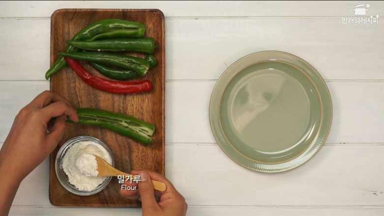 在去掉籽的內(nèi)側(cè)沾上面粉