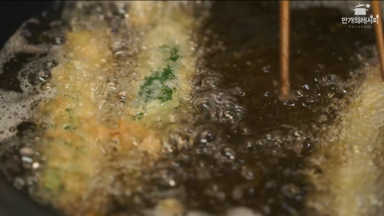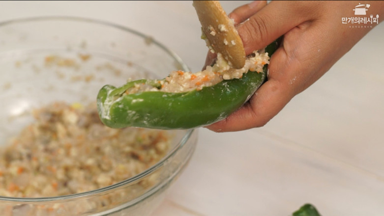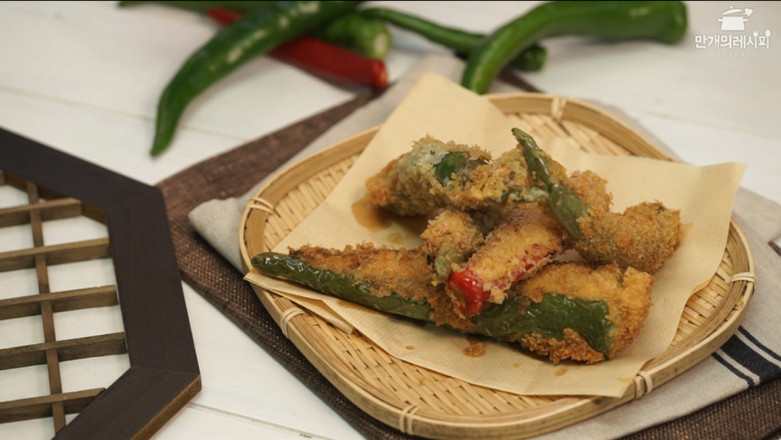 在辣椒外面依次包裹面粉、蛋液和面包粉。