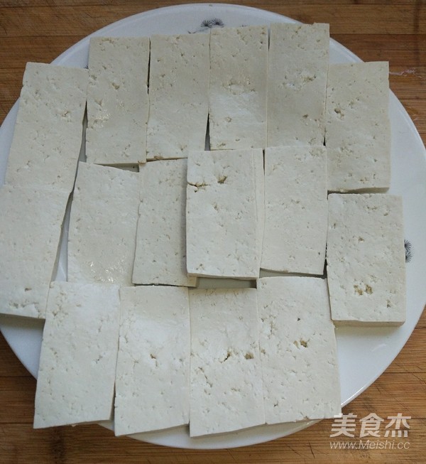 2.豆腐切8毫米左右的厚片。