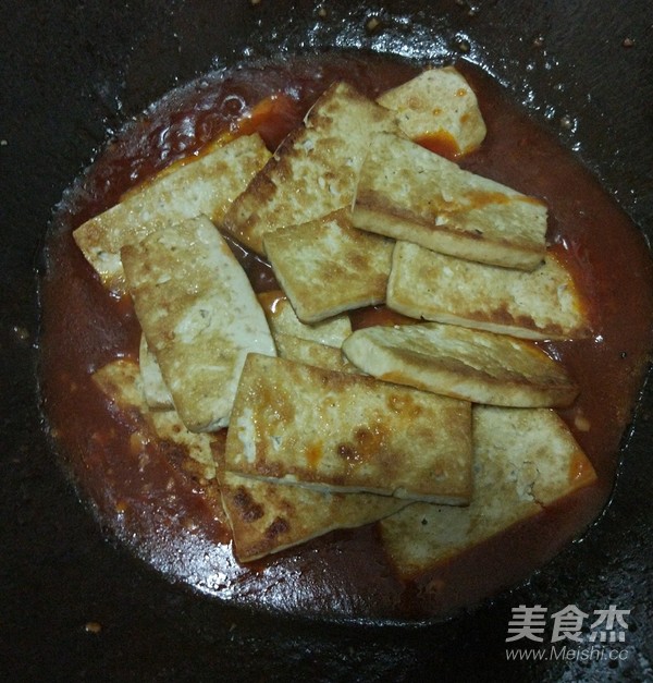 12.下入煎好的豆腐片,迅速翻炒。
