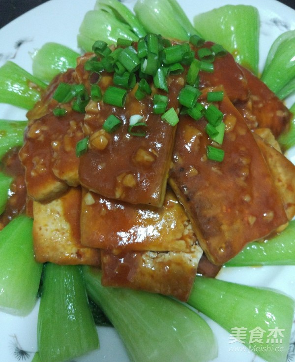 14.豆腐塊澆在油菜上面。