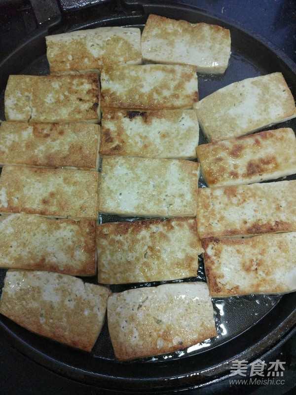 5.豆腐片入加熱的電餅檔,兩面煎制金黃取出。
