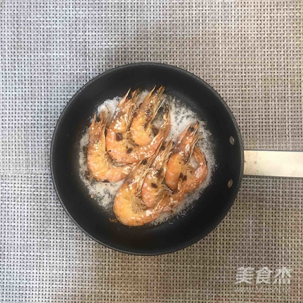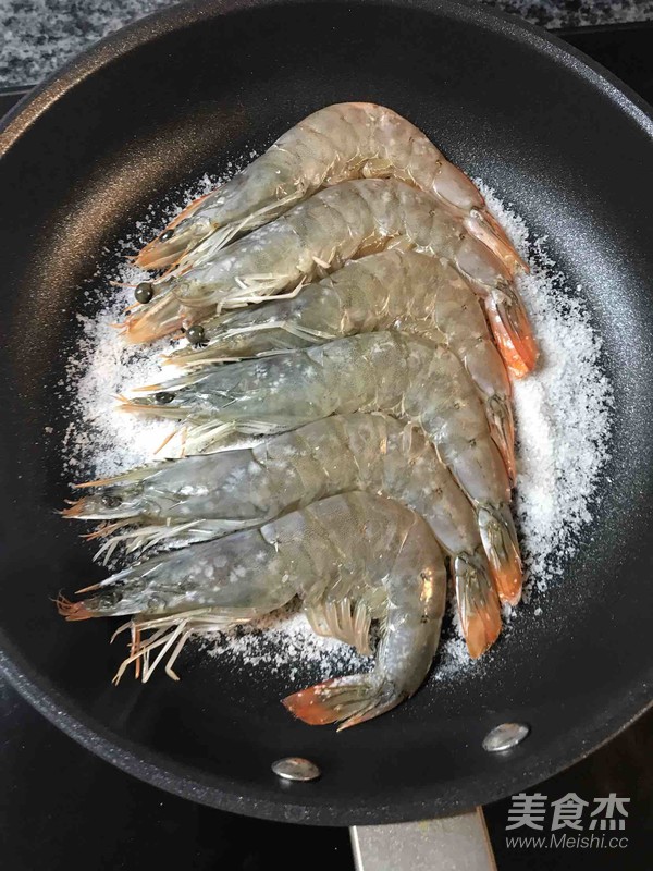 將蝦平鋪于鹽上,轉小火。聽到噼啪聲之后關火即可!