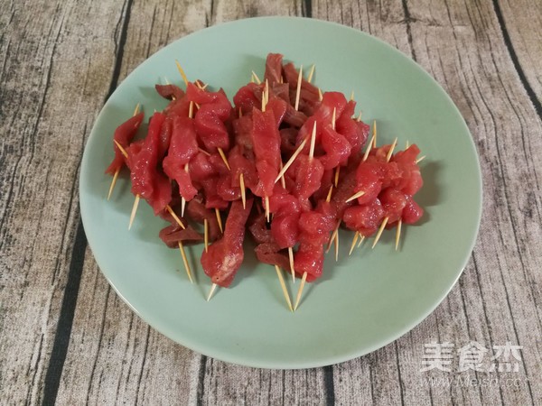把牛排切成薄厚均勻的長片,穿上牙簽