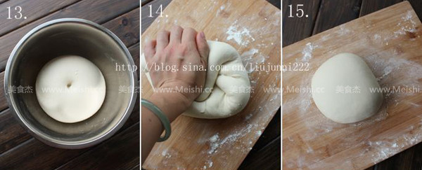 14.將發酵好的面團取出放在撒有一層薄粉的案板上,充分地揉壓出里面的空氣