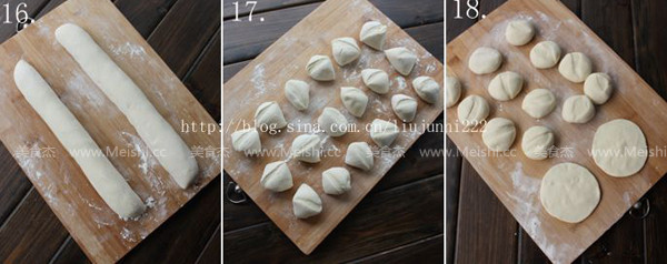 18.將劑子按扁,然后用搟面杖將它搟成中間略厚邊緣稍薄的面皮