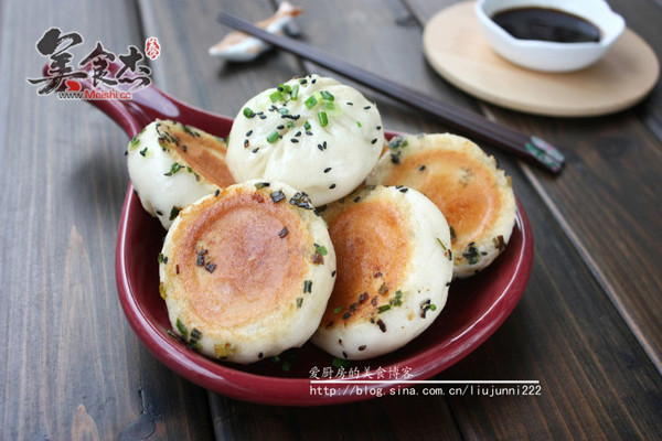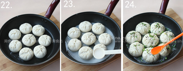 24.打開鍋蓋,轉小火,再淋入少許油,將包子煎至底部金黃酥脆;最后撒入芝麻與蔥花即可