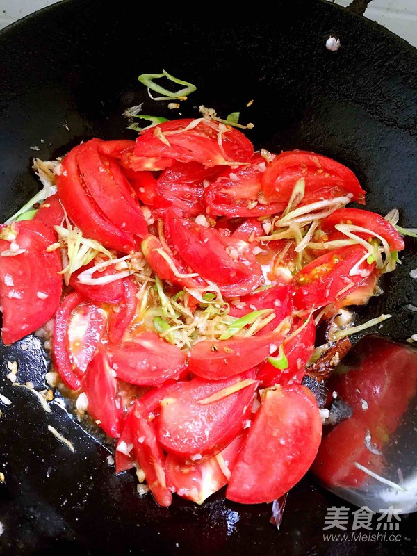 4.加入西紅柿大火翻炒,再加水加蓋煮湯