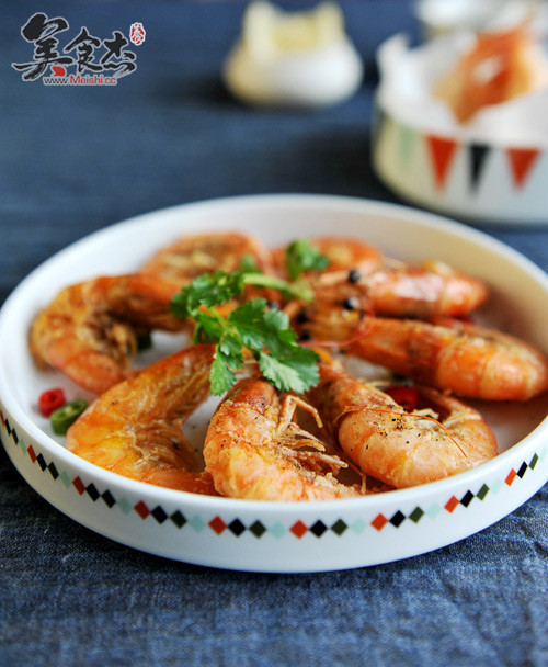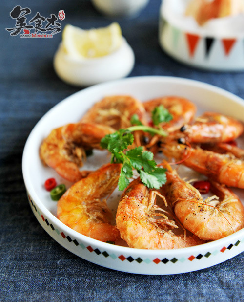 6.炒鍋燒熱,放入椒鹽炒香,再放入炸好的蒜蓉和青紅椒圈,倒入蝦,翻炒均勻即可出鍋