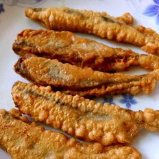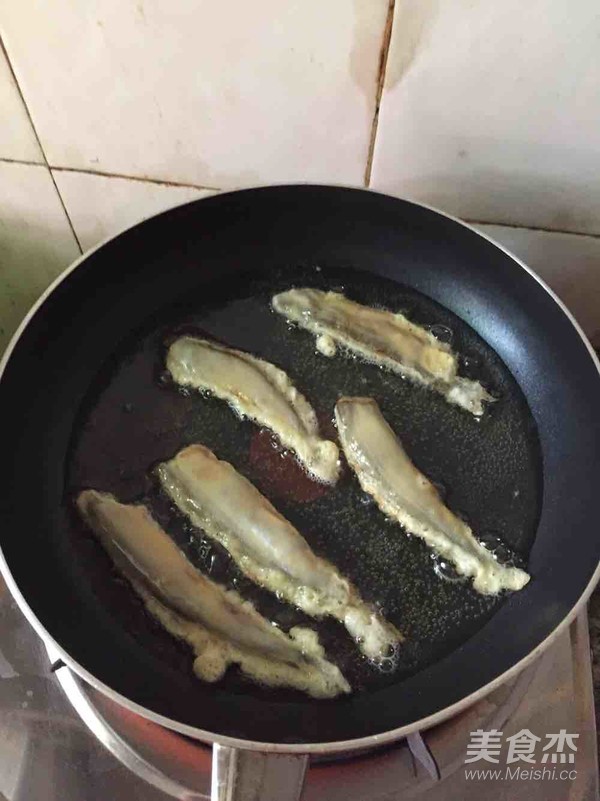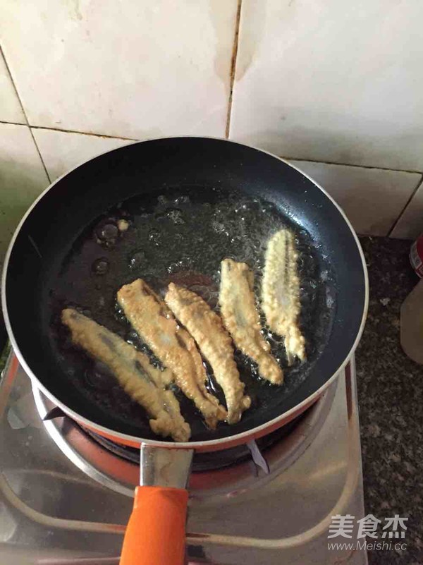 油溫七成熱時,放入裹好面糊的魚,小火慢煎